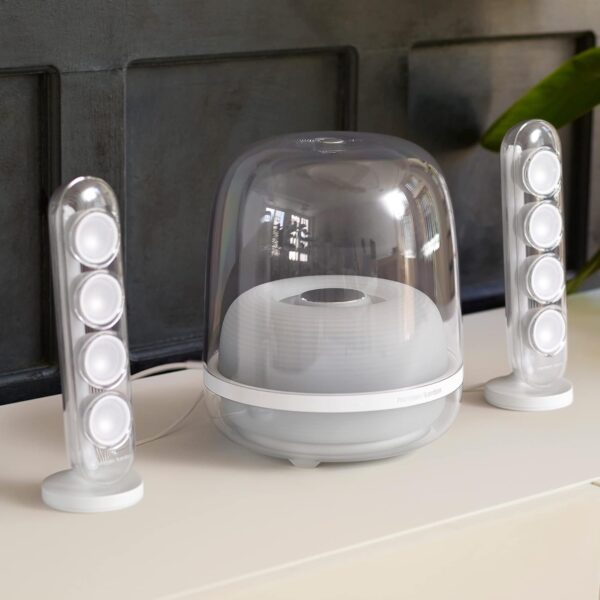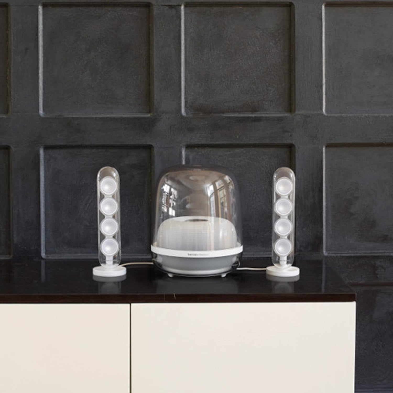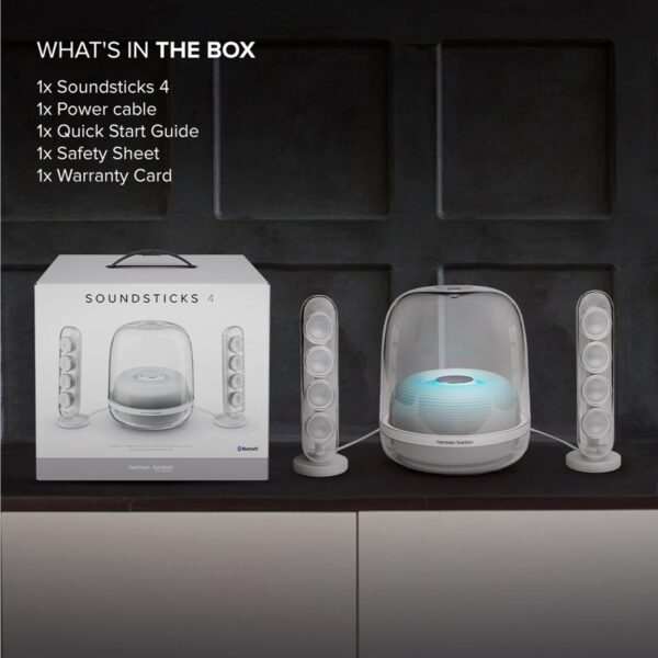 Harman Kardon SoundSticks 4 make a statement in any contemporary home. The groundbreaking transparent dome design and sleek silhouette blend in seamlessly with your decor. The two satellite speakers and subwoofer cover look stunning with an inner rippled surface design reflecting the beauty of music.