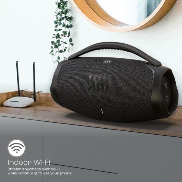 Your listening adventures can last all day as you take the JBL Boombox 3 Wi-Fi and Bluetooth speaker with you from room to room, then out to the beach or a backyard pool party. And with 24 hours of battery life, you can play music ’til the sun goes down—and comes back up again—before you’ll need a recharge.