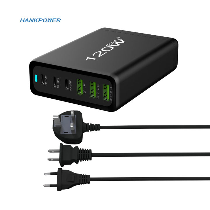 Featuring six versatile ports—including 2 USB-C PD (Power Delivery) ports and 4 USB-A Quick Charge ports—this charger can simultaneously support smartphones, tablets, laptops, power banks, Bluetooth accessories, and more. With a maximum power output of 120W, it’s ideal for users who need rapid and reliable charging for multiple high-demand devices, whether at home, at work, or on the go.