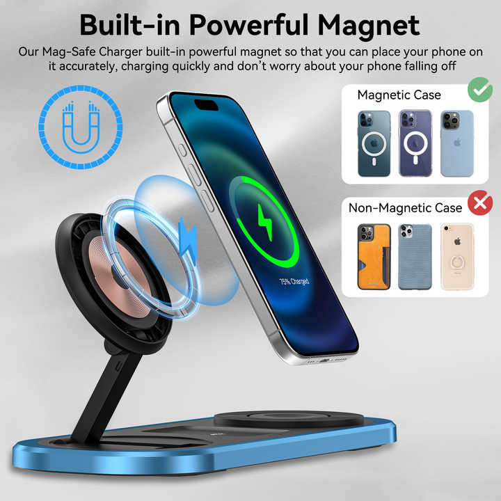 The 3-in-1 Magnetic Wireless Charger is ideal for users of Apple’s ecosystem, offering fast wireless charging for all three devices at once — no more tangled cables or multiple adapters. The charger folds neatly into a compact shape, making it easy to carry in your bag or pocket while traveling.