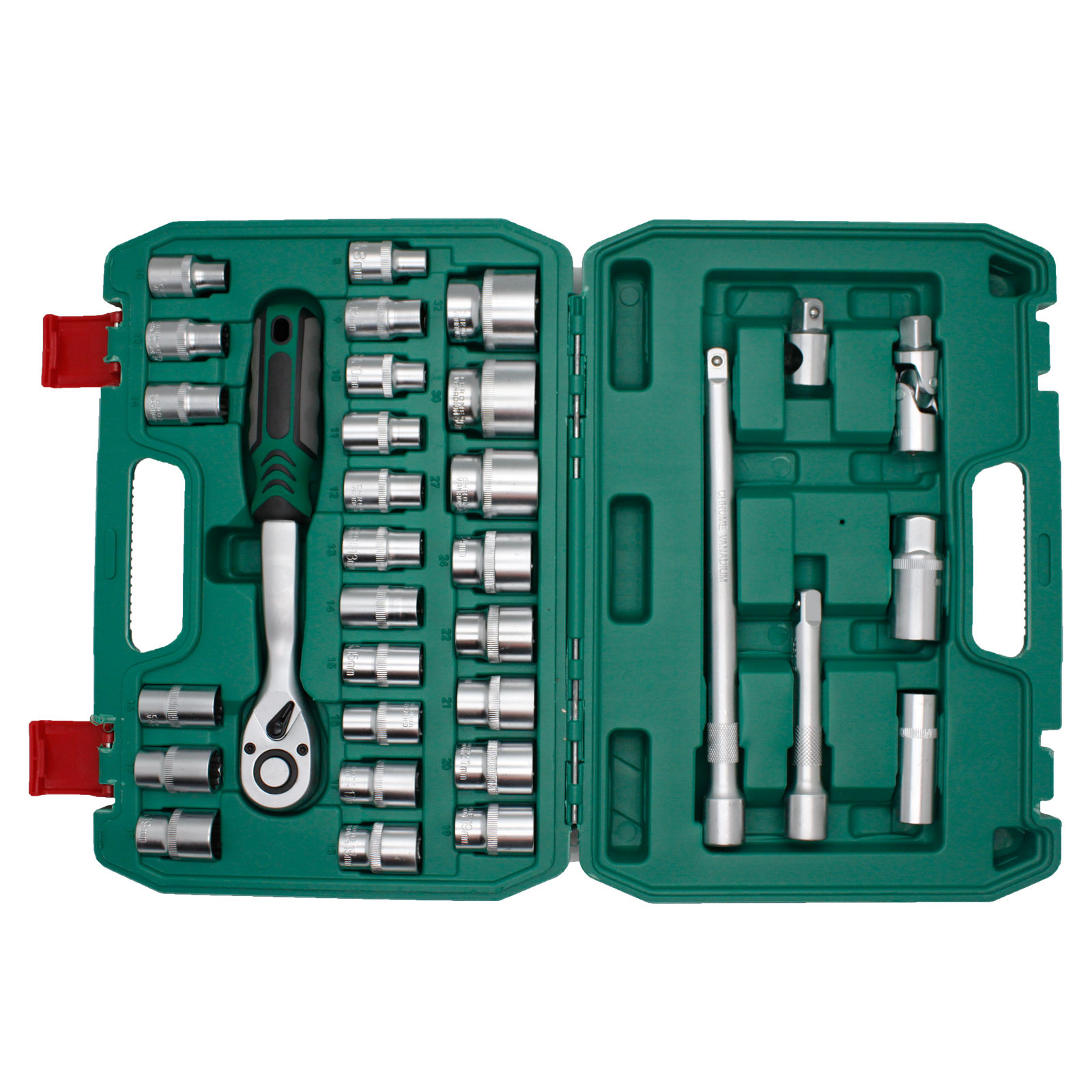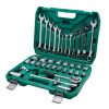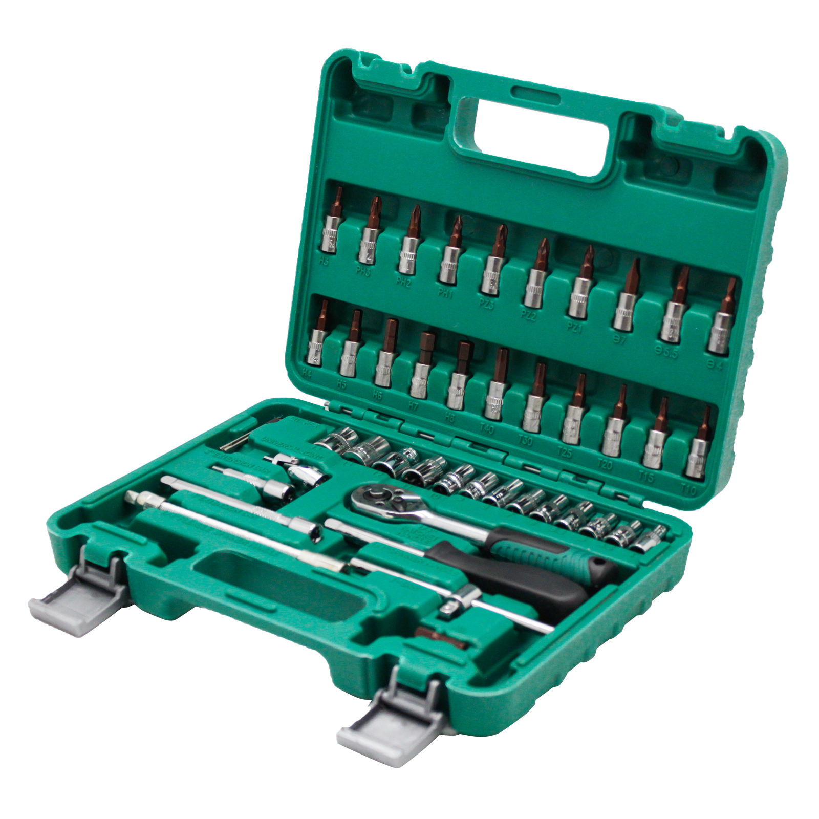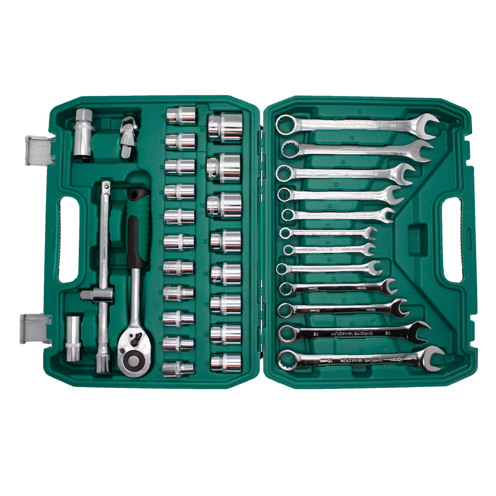 46-Piece Complete Kit: Includes sockets, ratchet handle, wrenches, extension bars, and more.